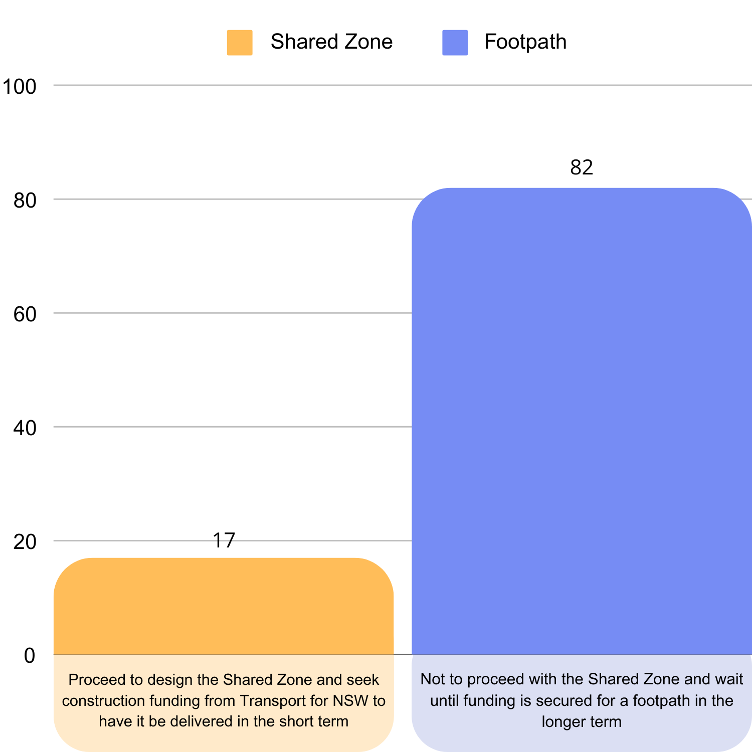 The community’s decision will inform our next steps as to whether we proceed with the Shared Zone funded by Transport for NSW or wait until funding is made available within Council’s budget for a footpath.